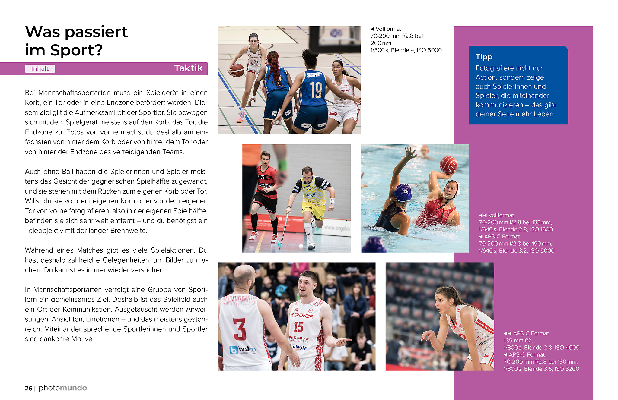 Du erfährst zum Beispiel, weshalb in der Sportfotografie oft eine Verschlusszeit von 1/640 oder 1/1000 Sekunde sinnvoll ist, warum eine Blende von 2.8 häufig ideal ist und weshalb hohe ISO-Werte in der Halle eine wichtige Rolle spielen. Gleichzeitig wird verständlich, wie sich damit Bilder voller Klarheit und Dynamik gestalten lassen.